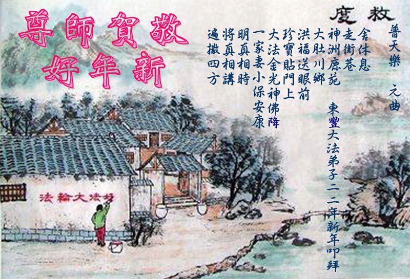 普天乐 元曲 救度 舍休息 走街巷 神州鹿苑 大肚川乡(东丰县古名) 洪福送眼前 珍宝贴门上 大法金光神佛降 一家妻小保安康 明真相时 将真相讲 遍撒四方 吉林省辽源市东丰县大法弟子二零二二年新年叩拜! 吉林省辽源市东辽县全体大法弟子给师尊拜年!恭祝慈悲伟大的师尊新年快乐!