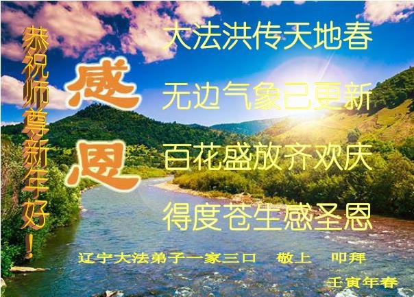 感谢师尊对我们的慈悲保护与救度 辽宁省营口市中部两位大法弟子恭祝师尊过年好! 弟子叩谢师尊! 辽宁省抚顺市大法弟子携全家恭祝师尊过年好!