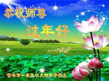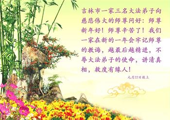 吉林市一家三位大法弟子向慈悲伟大的师尊问好:师父新年好!师尊辛苦了! 我们会在新的一年牢记师尊的教诲,越最后越精進,不辱大法弟子的使命,讲清 真相,救度有缘人。 吉林市大法弟子恭祝慈悲伟大的师尊新年快乐!