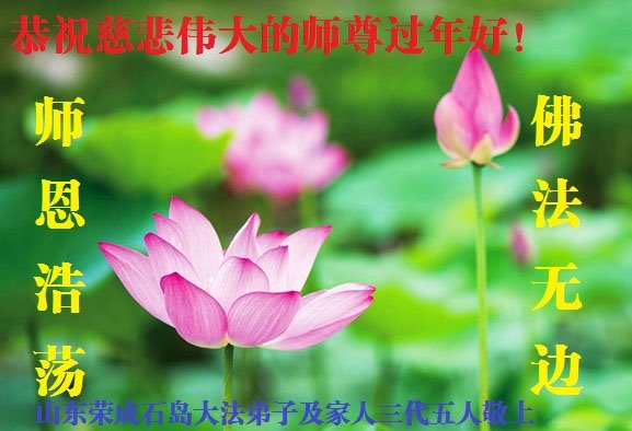 转眼又是一年,中国新年即将到来,弟子恭祝师父新年好!新年快乐!在新的一年里,弟子一定按照师父要求的把三件事做好,遇事向内找,修好自己,救度众生,跟师父回家。 山东省烟台市芝罘区大法弟子及全家恭祝慈悲伟大的师尊过年好!