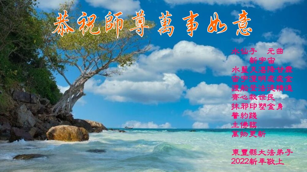 水仙子 元曲 新宇宙 水蓝天湛降甘霖 宙宇澄明处处金 渡船登法徒精進 齐心救世民 抹邪印塑金身 誓约践 师尊临 万物更新 吉林省辽源市东丰县大法弟子敬上! 吉林省辽源市全体青少年大法弟子恭祝师尊过年好!