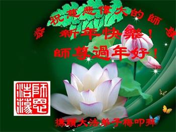 我是辽宁省阜新市大法弟子,我40岁得法,今年66岁了。我没有见过师父,但在我修炼时,听到师父说我的声音。一次早晨炼功起不来时,我听到师父喊我的小名叫我起来;那声音又洪亮又透彻。在睡梦中、打坐中,我看到师父看护着我、保护着我。师父珍惜我们,我时常想师父回大陆时,大法弟子会齐刷刷跪下给师父叩头:师父好!法轮大法好! 新年恭祝师父好 千神万佛祥云绕 大法全盛普天颂 洪宇香风莲花飘 辽宁省营口大石桥市东部一大法弟子敬祝师尊过年好!弟子跪拜师尊!