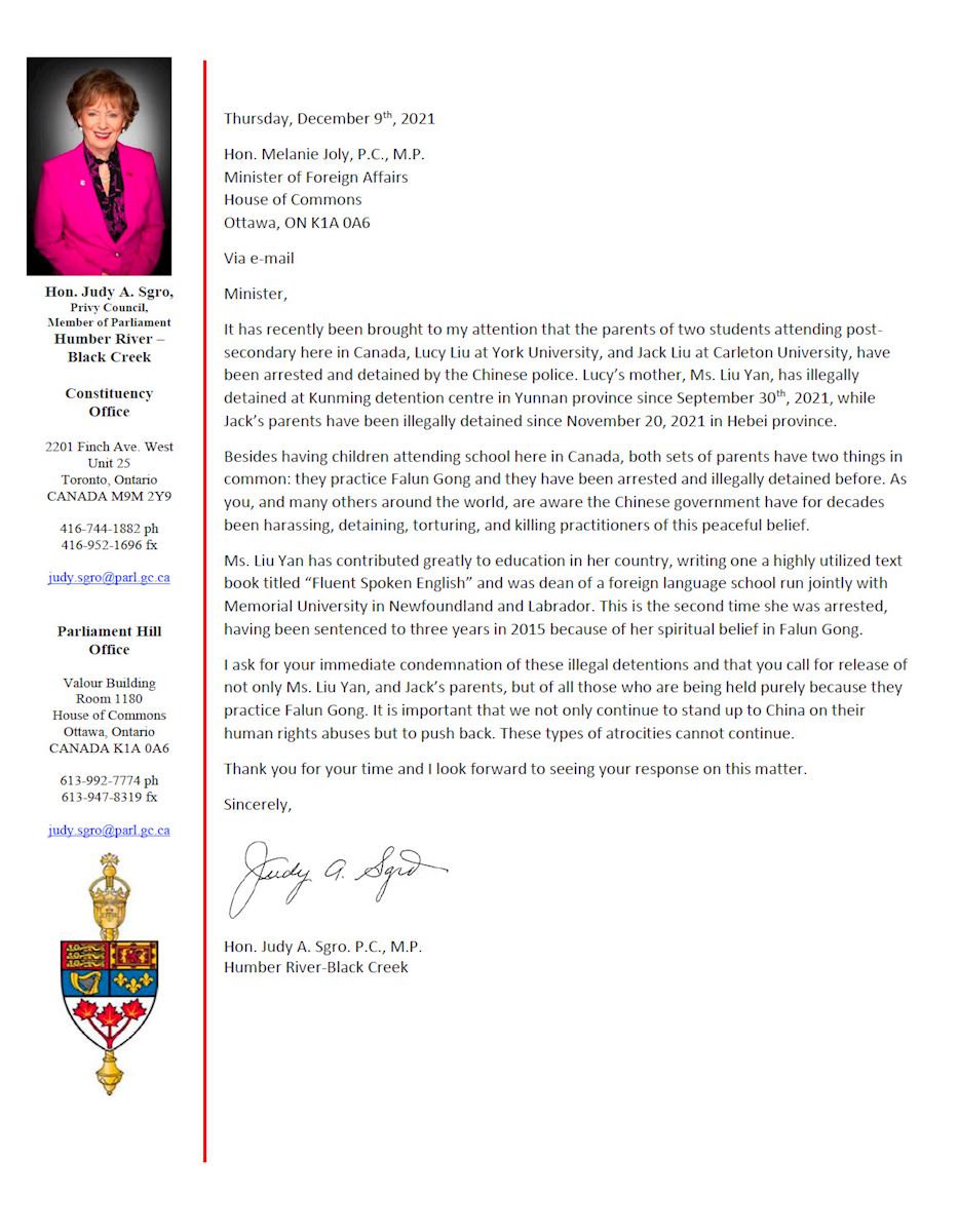 | 【明慧网二零二二年一月七日】(明慧记者英梓加拿大报道)距北京冬季奥运会还不到一个月。中共不断加紧“维稳”。法轮功学员再次成为中共监控和打压的首要目标。 近日,加拿大卡尔顿大学中国留学生刘之源告诉明慧记者,他的母亲、法轮功学员曹雯已经于去年(二零二一年)十二月二十七日被释放,但仍受到警方严密监控。他父亲刘舟波仍然被非法关押在北京第三看守所。刘之源呼吁善良的人们帮助营救父亲刘舟波。 去年十一月十九日,刘舟波和曹雯同时在家中被绑架,中共警察抄家后,没收了他们的手机、法轮功书籍和其它法轮功真相资料。夫妇二人被指控在北京地铁上使用蓝牙发送有关法轮功的短信。 在被非法关押三十九天后,曹雯才被第二看守所释放。而北京市公安局公共交通安全保卫分局在发给曹雯的处决书中只提及行政拘留十五天。 据刘之源介绍,他的父亲、法轮功学员刘舟波是掌握石油压裂核心技术难得的人才,曹雯也是石油开发项目的专业技术人员。一九九五年,刘舟波开始修炼法轮功后,曹雯也开始修炼。他们象所有法轮功修炼者一样在生活中秉持真、善、忍理念。 因为拒绝放弃信仰,在中共对法轮功持续二十多年的迫害中,刘舟波曾被非法判刑九年。刘之源说:“那九年的生活如同地狱一般,父亲遭受酷刑、饥饿,并受到死亡威胁,但他仍然坚持自己的信仰。二零一零年,回来后的父亲和母亲都继续修炼法轮功。” 二零零八年奥运前的“死亡指标” 据明慧网统计,二零二一年获知一百三十一名法轮功学员被中共迫害离世。 据明慧报导,冬奥前夕,警察以北京冬奥会维稳为名,加强了监控、骚扰和绑架法轮功学员。 迫害之初,江泽民曾公开叫嚣,“三个月消灭法轮功!”江泽民还亲自给主管镇压法轮功的六一零办公室下达密令,对法轮功“打死算自杀,不查身源,直接火化”,每个劳教所还有死亡指标等。北京奥运前,二零零七年三月,中共前公安部长周永康向全国下达了新一轮严厉打压法轮功的命令。吉林省大安市政法委书记、“六一零”主任刘云华在会上公开扬言:上边有令,奥运之前要杀一批。 二零零七年七月十三日,大安市警察绑架了吉林油田红岗采油厂职工法轮功学员沙乃意,第二天便被迫害致死。 北京音乐人于宙在二零零八年二月六日被迫害致死,遗体仍被冷冻着。他的妻子许那也多次被绑架关押,两次被非法判刑。二零二零年七月十九日上午,许那在家中作画时,被北京顺义区空港派出所警察伙同国保绑架,家中剩下年迈的父亲。目前,许那被非法关押在北京东城区看守所,曾一度绝食反迫害。 麦塔斯:法轮功深入人心 令中共惧怕 人权律师麦塔斯接受媒体采访时表示,中共对法轮功的巨大畏惧,可从中共前党魁江泽民一九九九年发动迫害前给中共中央政治局常委的一封信看出来。 麦塔斯说:“法轮功修炼者人数众多,修炼者都是自律的,遍及中国,遍及中国社会的社会机构、职业机构和知识机构,遍及党和政府系统。” 他说,法轮功是根植于佛道思想的修炼形式,包括对道德行为的严格要求,是追求神佛和更高精神领域的信仰,有系统的修炼方式,旨在影响人的道德升华和内在净化。其核心是真、善、忍最高准则。 他强调,法轮功是信神的;而共产主义是无神论。“法轮功在中国如此传播广泛、如此受欢迎,是因为法轮功是中国的信仰和修炼传统的融合。相比之下,共产主义是西方引进的。在中国,法轮功引起了共鸣,而共产主义没有。” “现实情况是,党不可能让十亿人相信毫无意义的东西,党不过是权力的载体。普通中国人没有理由拥护党。所以,党是害怕的。” 麦塔斯发现,极权者不能允许任何权威——甚至是神的威严——凌驾于自己之上。极权者认为,除了对其党的忠诚之外,不可能有忠诚,除了党规定的以外,没有意义,没有法令或武力无法改变的真理。 加国议员致函总理要求营救被非法关押的法轮功学员  图1:加拿大国会法轮功之友联合主席,国会议员斯格若(Judy Sgro)二零二一年十二月十日,向总理特鲁多发电子邮件,要求总理立即谴责中共对法轮功学员的非法拘禁,并要求释放加拿大人家属。 |