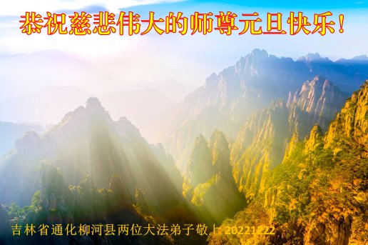 恭祝慈悲伟大的师尊元旦快乐! 轮回辗转千万年 幸喜今生结圣缘 得法修心脱苦海 蹬上法船奔彼岸 师尊慈悲救众生 助师正法随师行 待等春回大地暖 法正人间把师迎 吉林省通化市柳河县两位大法弟子恭祝慈悲伟大的师尊元旦快乐!