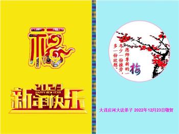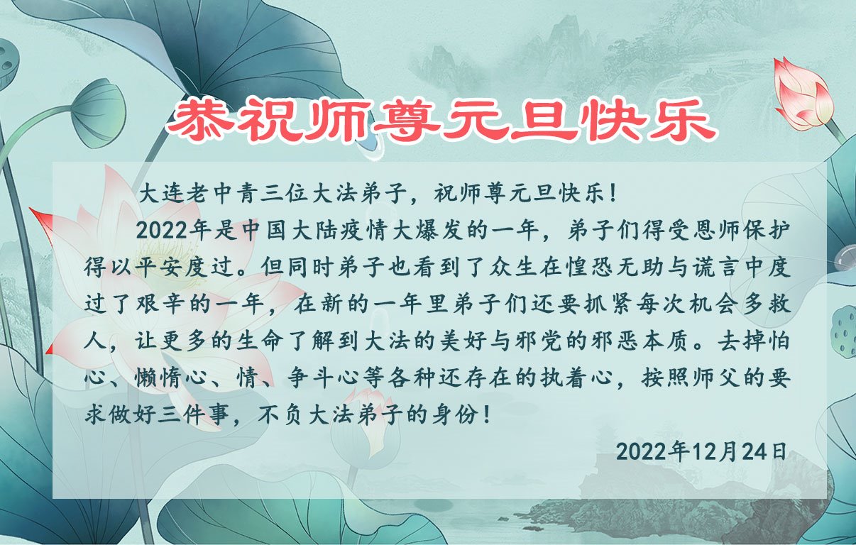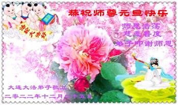 【明慧网二零二二年十二月二十九日】 辽宁省大连大法弟子及家人恭祝师尊新年快乐!
