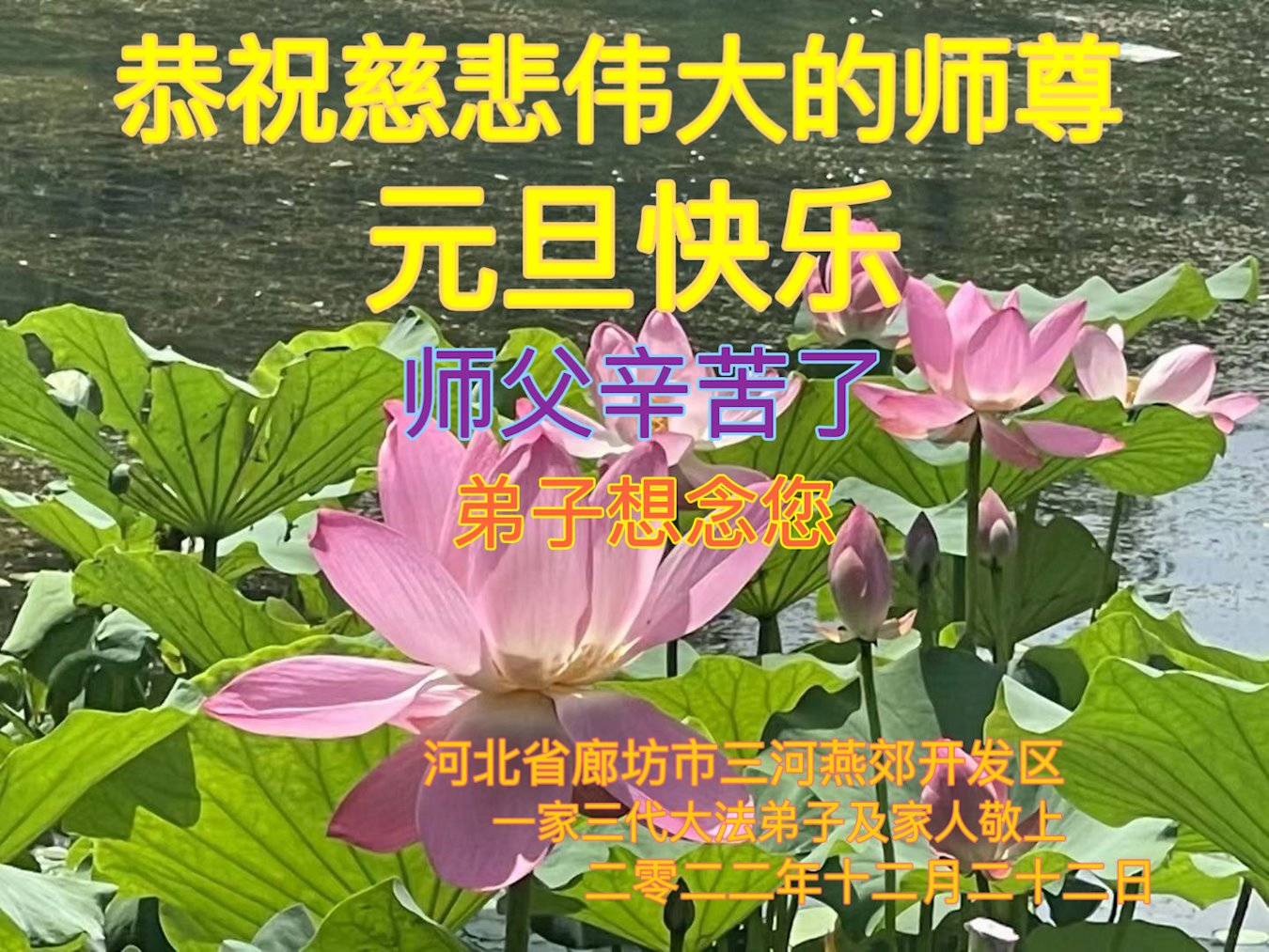 师父辛苦了!弟子想念您!河北省廊坊市三河燕郊开发区一家三代大法弟子及家人敬上 二零二二年十二月二十二日 河北廊坊一大法弟子及家人恭祝师尊新年快乐!