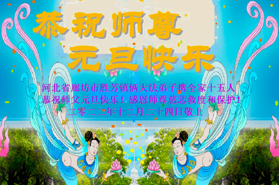 河北省廊坊市胜芳镇俩大法弟子携全家十五人恭祝师父元旦快乐!感恩师尊慈悲救度和保护! 二零二二年十二月二十四日敬上 河北省廊坊市堂二里镇全体大法弟子恭祝师父元旦快乐!