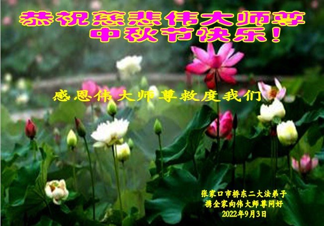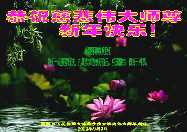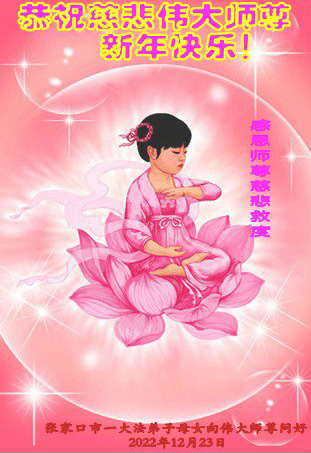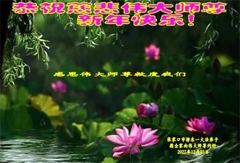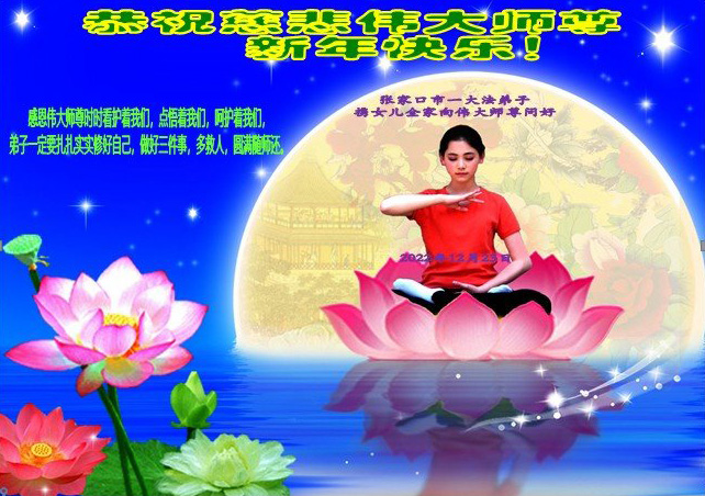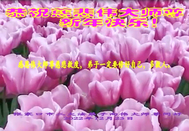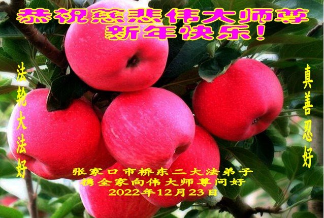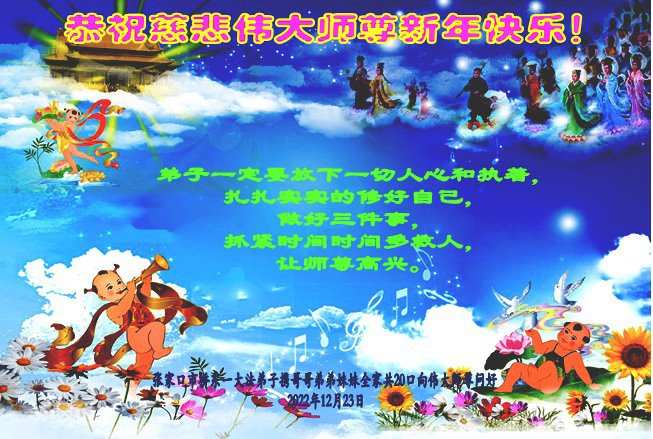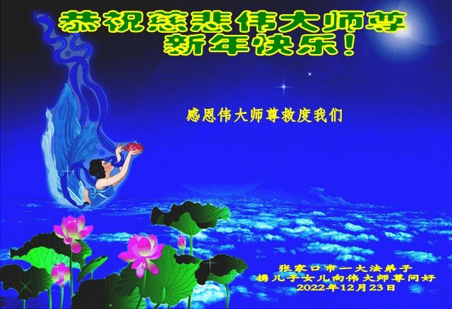 恭祝伟大师尊新年快乐! 感恩伟大师尊救度我们 感恩伟大师尊洪恩浩荡 感恩伟大师尊法力无边 感恩伟大师尊慈悲保护 弟子每一刻每一步的升华和提高都浸透着师尊的苦心安排和心血,今后的日子,弟子一定要更加珍惜,在净心学法上多下功夫,踏踏实实的修自己,多救人,向师尊要求的纯金、赤金二十四K金的标准攀登。 弟子一定要学好法,扎扎实实修好自己,做好三件事,抓紧时间救人。 张家口市一大法弟子携全家人 2022年12月23日 河北省张家口一大法弟子全家恭祝伟大师尊新年快乐!
