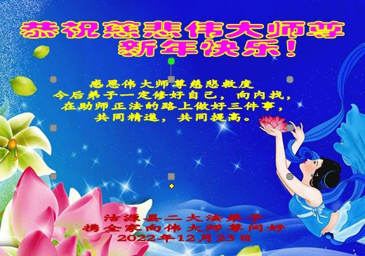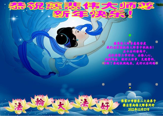 恭祝伟大师尊新年快乐! 感恩伟大师尊慈悲救度,弟子一定要修好自己,多救人。 张家口市两位大法弟子向伟大师尊问好 2022年12月23日 河北省张家口下花园张家口桥东两位大法弟子携全家人恭祝伟大师恭祝伟大师尊新年快乐!