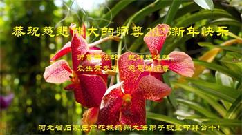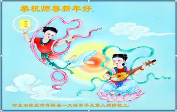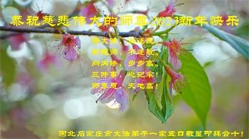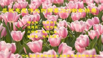 恭祝慈悲伟大的师尊新年快乐! 法轮大法好,真善忍好。 河北石家庄市一炼功点大法弟子敬呈 叩拜 合十 河北省石家庄市大法弟子恭祝师尊新年快乐!