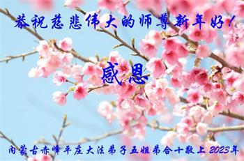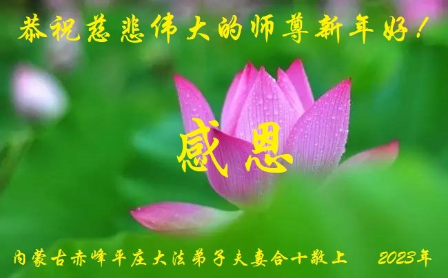 二零二三年新年即将来临,我们祖孙俩是赤峰市大法弟子,我们恭祝慈悲伟大的师父新年快乐!我们一定尽力做好三件事,抓住一切机会救人。 内蒙古赤峰平庄大法弟子恭祝师尊新年好!