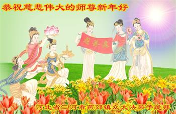 师父,您好,我们学法小组的大法弟子恭祝您新年快乐!感谢师父一路保护!弟子们一定在以后的日子里做好三件事,多向内找,修好自己,多救人,少让师父操心,谢谢师父! 河北省廊坊市王寨全体大法弟子恭祝师父新年快乐!