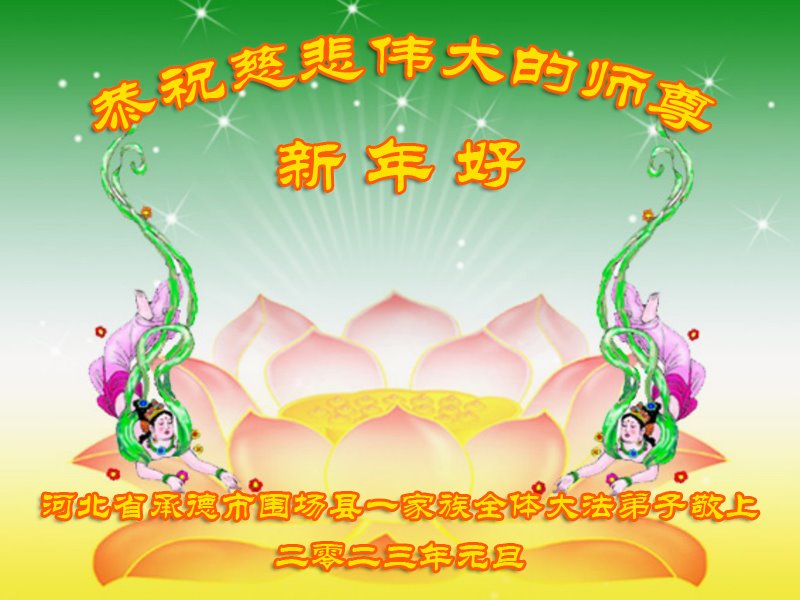 新年来临之际,在正法的最后时刻,我们唯有修好自己,做好三件事,才能走好、走正最后的这段不平凡的正法之路!兑现史前大愿,抓紧时间多救人,不负师尊对我们的苦度和期望! 代家人及得救众生恭祝师尊新年好! 河北省邢台市清河县夫妻大法弟子恭祝慈悲伟大师尊新年好!