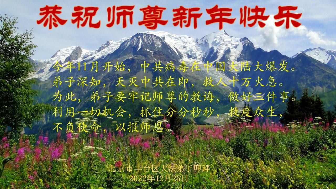 师父: 您好! 今年11份月开始,中共病毒(武汉肺炎)在中国大陆海啸式爆发,很多人已经相继去世,无数的人已经被感染。 弟子深知,天灭中共在即,救人十万火急。 为此,弟子要牢记师尊的教诲,做好三件事。利用一切机会,抓住分分秒秒,救度众生,不负使命,以报师恩。 北京市丰台区大法弟子叩拜 2022年12月25日 湖北孝感应城市东马坊全体大法弟子恭祝师尊新年快乐!