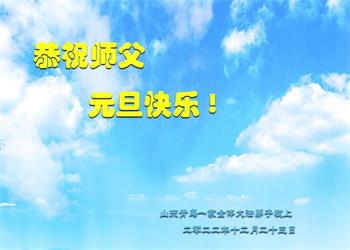 师尊好!弟子一定精進实修,做好三件事,去掉那些肮脏的私心,修成无私无我的正觉,跟师尊回家。叩谢师恩! 山东省青岛市莱西城区一老年学法小组大法弟子恭祝师尊元旦快乐!