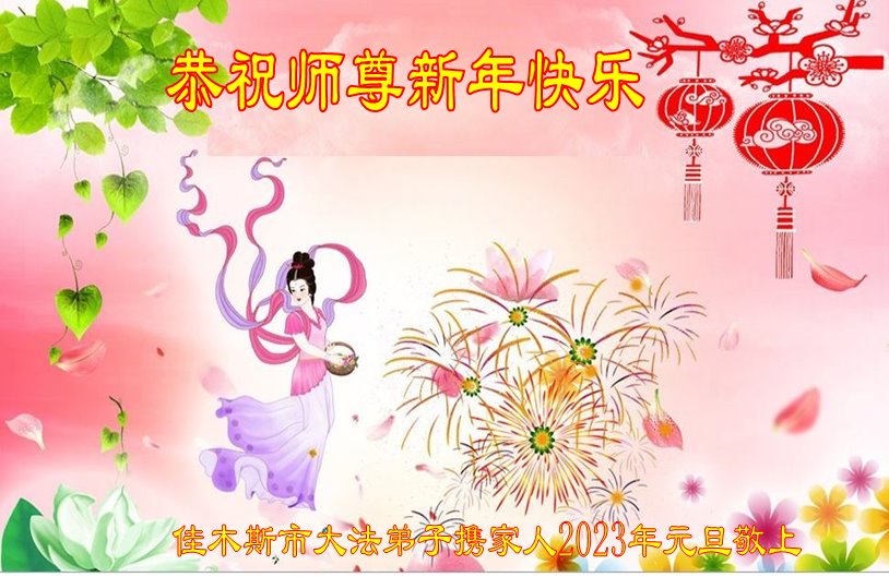 恭祝师尊新年快乐! 黑龙江省佳木斯市一大法弟子敬上 黑龙江省佳木斯市一大法弟子携家人恭祝师尊新年快乐!