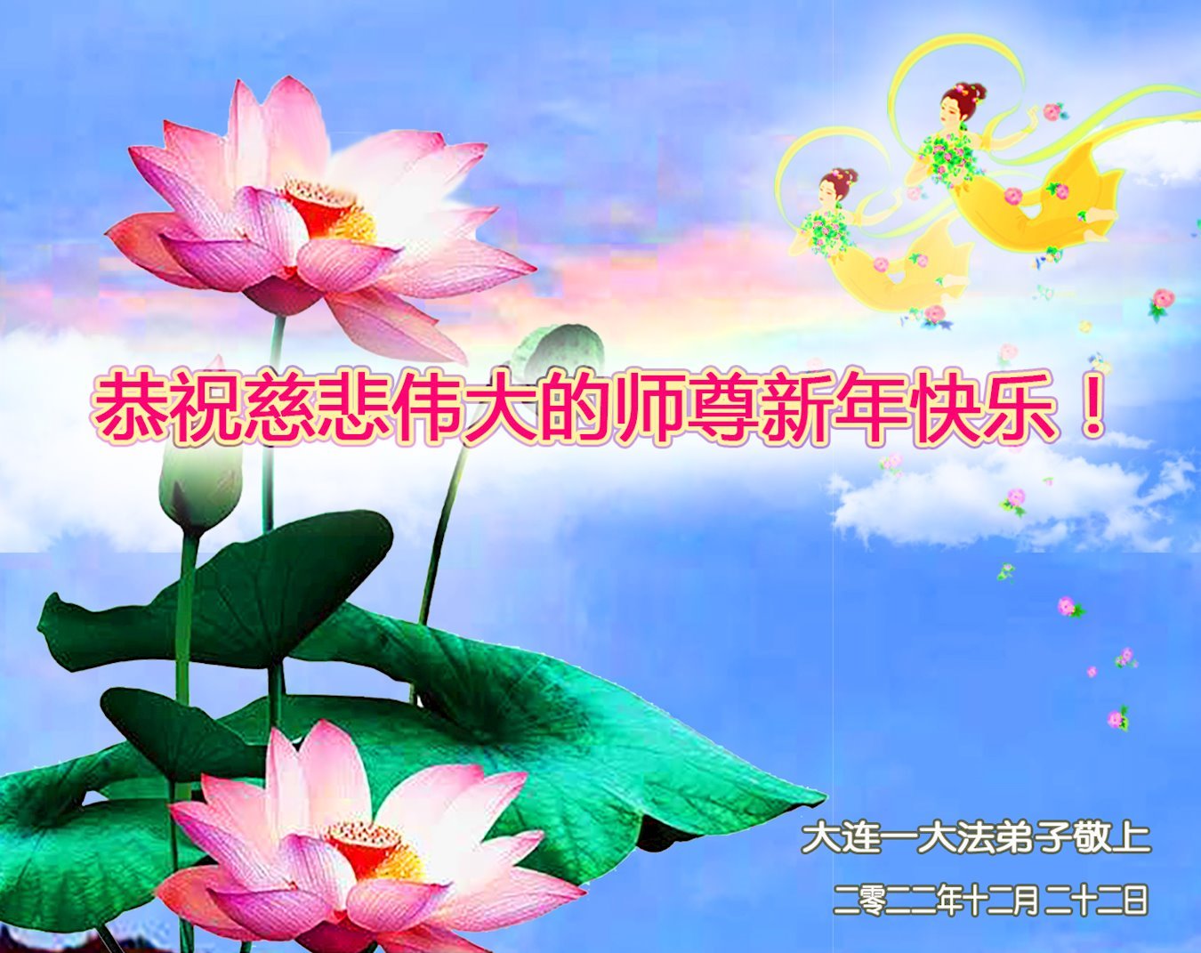 恭祝慈悲伟大的师尊新年快乐! 大连一大法弟子敬上 二零二二年十二月二十二日 辽宁省大连市大法弟子敬上一家恭祝师尊新年好!