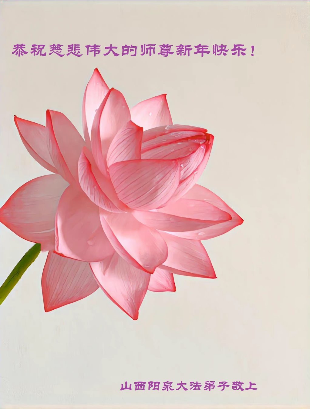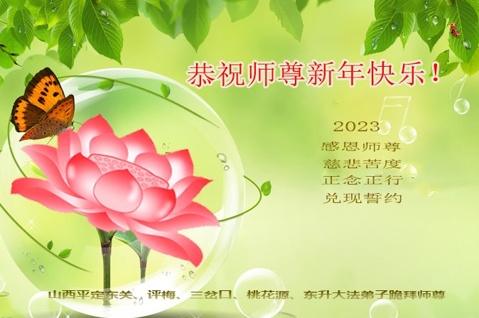 恭祝师尊新年快乐! 感恩师尊慈悲苦度,正念正行兑现誓约。 山西省阳泉市平定县东关、评梅、三岔口、桃花源、东升全体大法弟子敬上跪拜师尊 山西省晋中市昔阳县全体大法弟子敬上恭祝师尊新年快乐!