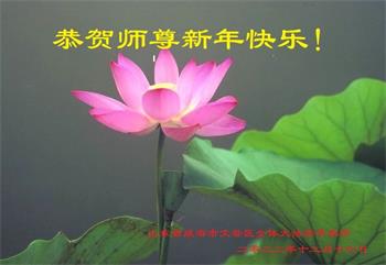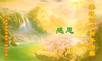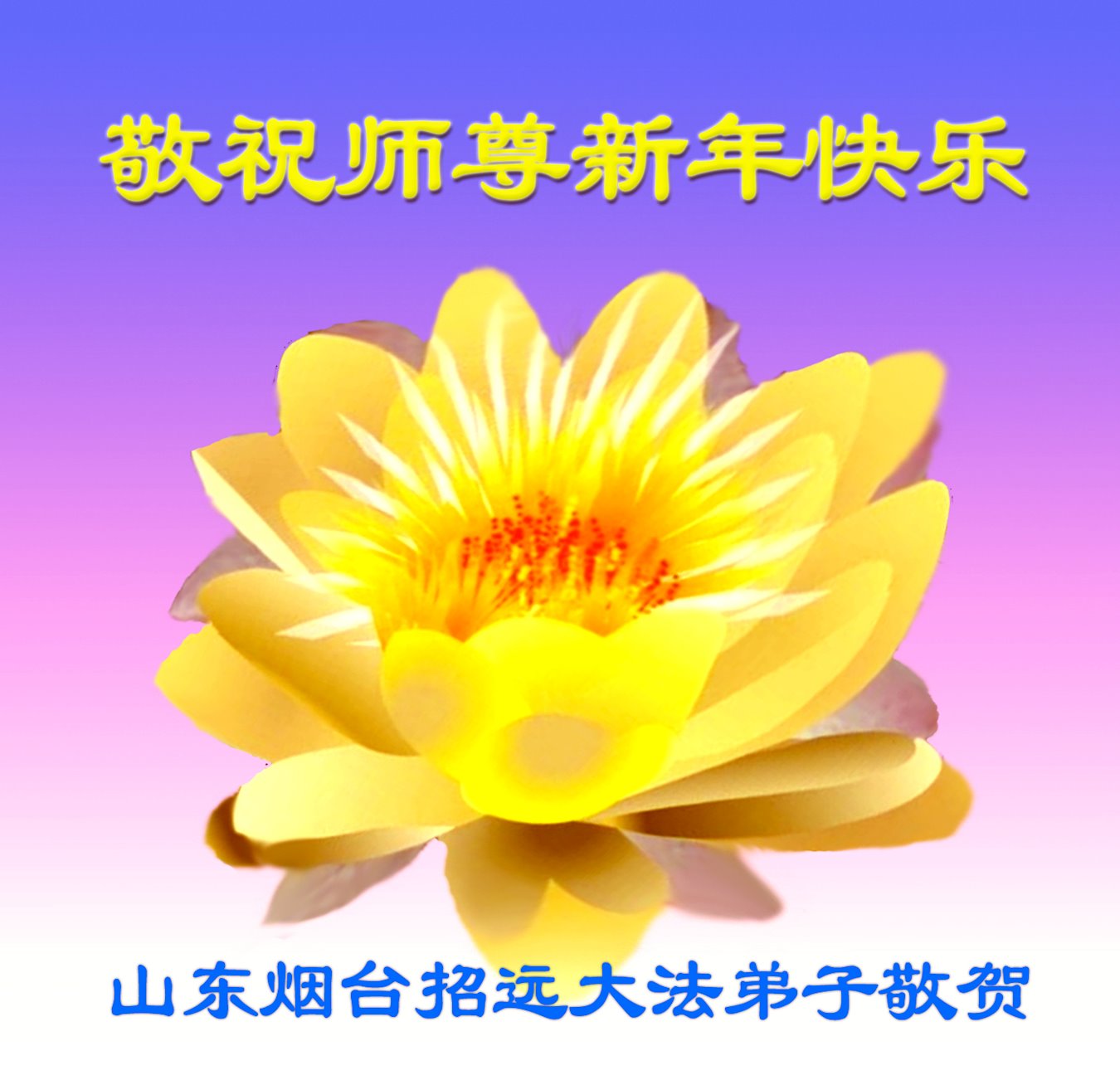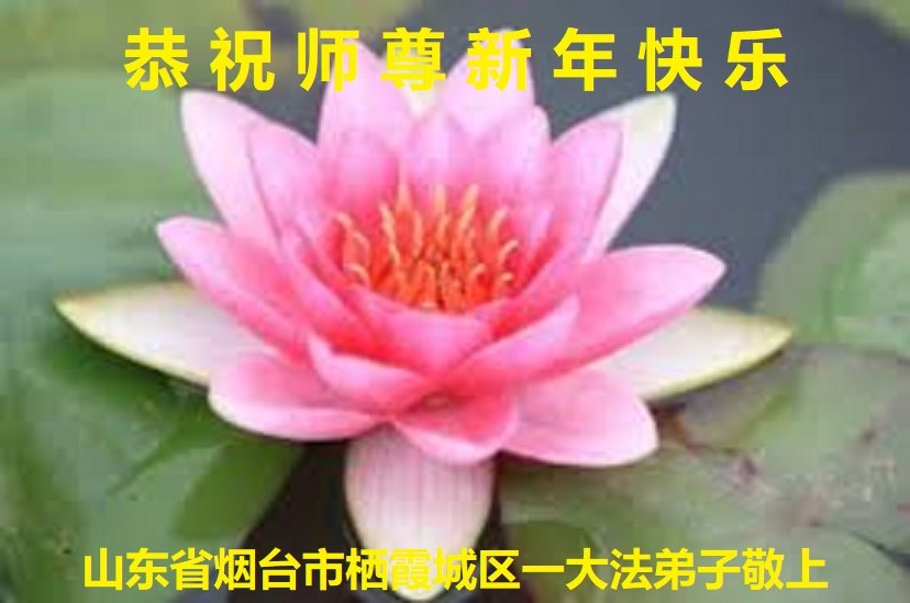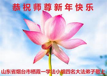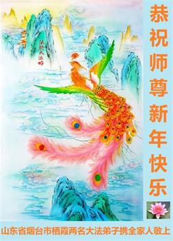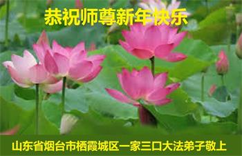 恭祝慈悲伟大的师尊新年快乐!感恩师尊慈悲救度! 弟子们一定更加精進,做好三件事,多救人,不辜负师尊的慈悲救度! 山东省烟台市栖霞城区一家三位大法弟子敬上 山东省烟台市栖霞两名大法弟子携全家人恭祝师尊新年快乐!