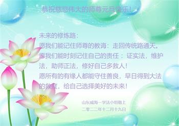 恭祝慈悲伟大的师尊新年快乐! 感谢师父的救度之恩,全家人跪拜师尊,师父您辛苦啦! 山东省烟台市栖霞两名大法弟子携全家人敬上 山东省威海市一学法小组大法弟子恭祝慈悲伟大的师尊元旦快乐!