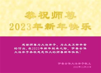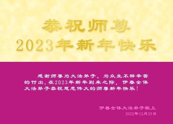 感谢师尊为大法弟子、为众生不辞辛苦的付出,在2023年新年到来之际,伊春全体大法弟子恭祝慈悲伟大的师尊新年快乐! 伊春全体大法弟子敬上 2022年12月23日 黑龙江省牡丹江市六区小组大法弟子恭祝师尊元旦快乐!