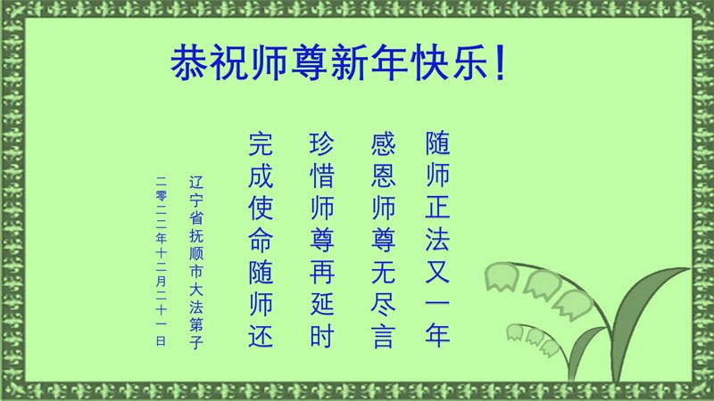 【明慧网二零二二年十二月三十日】 辽宁省鞍山市海城市大法弟子恭祝师尊元旦快乐!