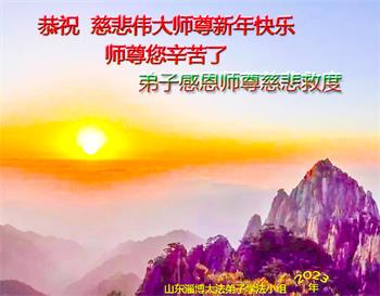 敬爱的慈悲伟大的师父:您好! 二十多年来,师父时时保护着弟子,感谢师父慈悲苦度。在新的一年里,我要听师父的话,多学法学好法,做好三件事,跟师父圆满回家。 山东一大法弟子问候师父新年好!
