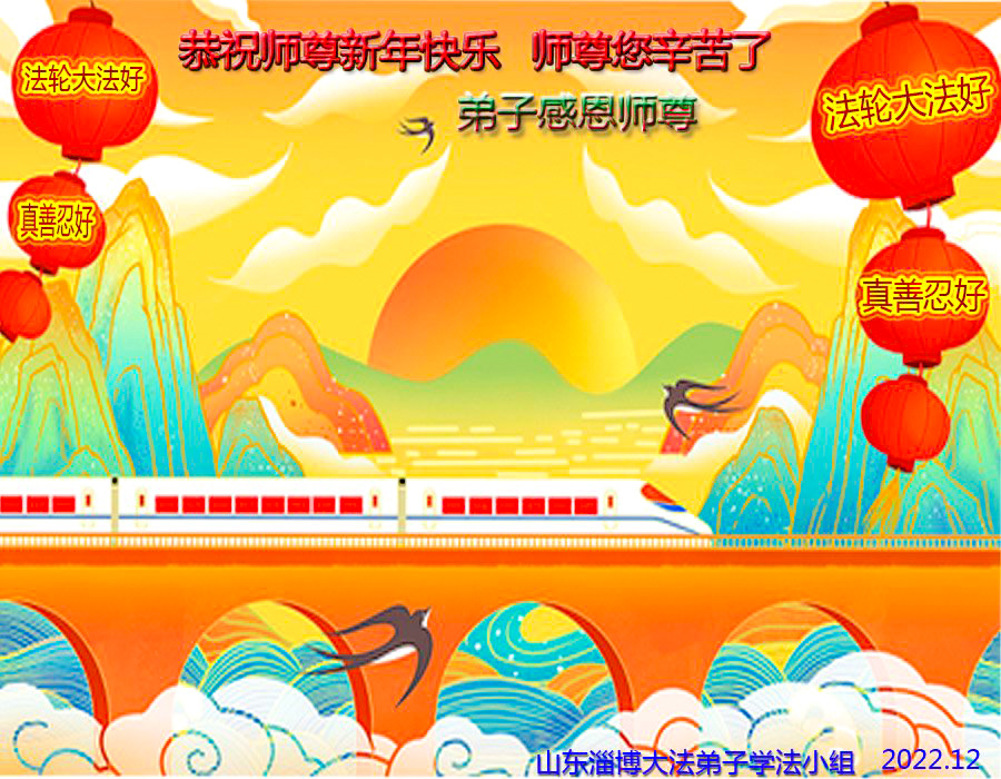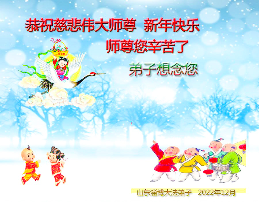 恭祝慈悲伟大的师父新年快乐!请师父放心,弟子们会一如既往的做好三件事!感恩师父的慈悲救度!盼望师父回家! 山东烟台莱阳一学法小组大法弟子敬上 二零二二年十二月二十五日 山东省淄博市全体大法弟子恭祝慈悲伟大的师尊新年快乐!
