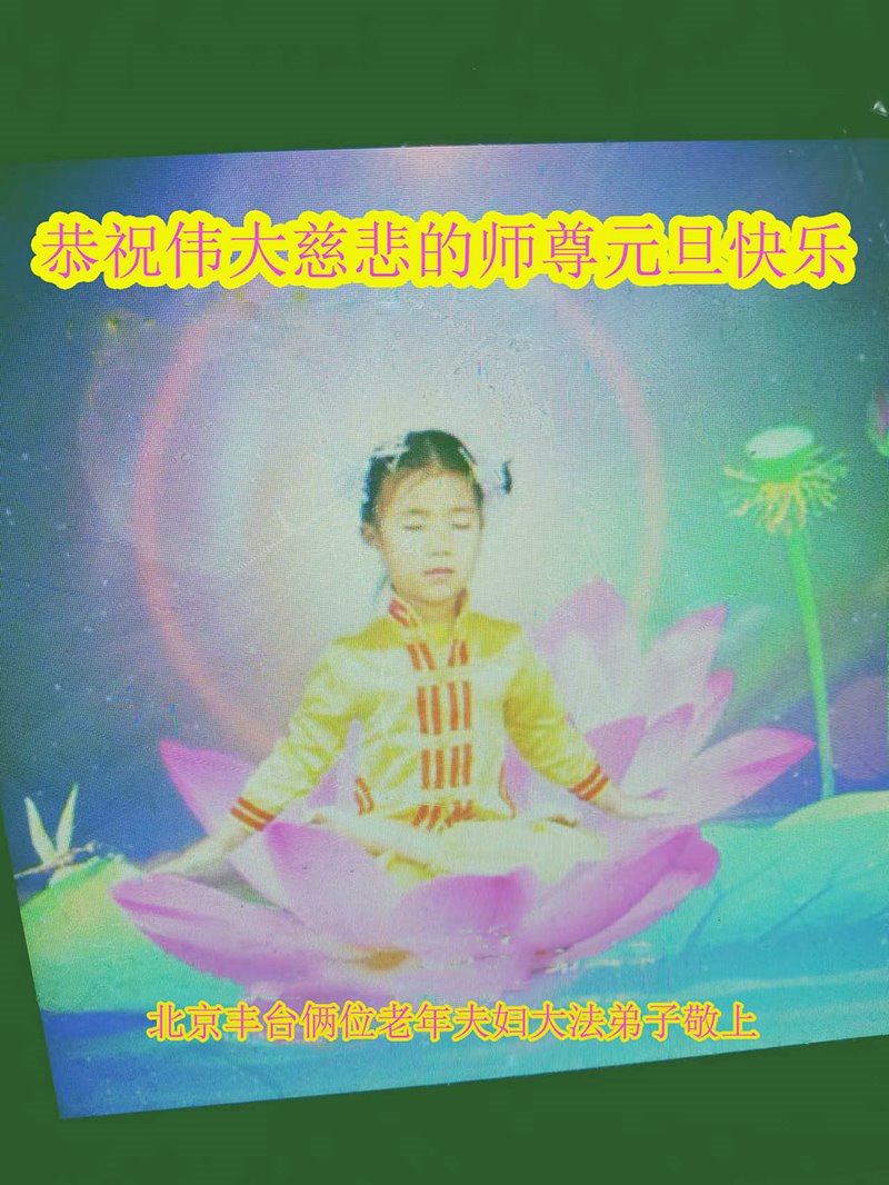 恭祝师父元旦快乐!弟子精進实修,盼早日与师尊团聚,助师法正人间,圆满随师还。 北京丰台干休所两位老年夫妇大法弟子及全家跪拜 北京丰台航天两位老年夫妇大法弟子及全家恭祝师父元旦快乐!