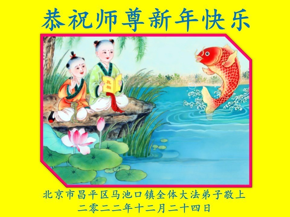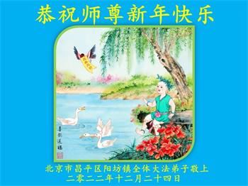 值此二零二三年到来之际,北京大法弟子向慈悲伟大的师尊致以最衷心问候和最崇高的敬意!师尊辛苦了,师尊新年好! 在未来的日子里,弟子将认真学法、勇猛精進、正念坚定、抓紧一切时机讲真相、踏踏实实救人,以此敬献伟大师尊。 北京市昌平区阳坊镇全体大法弟子恭祝师尊新年好!