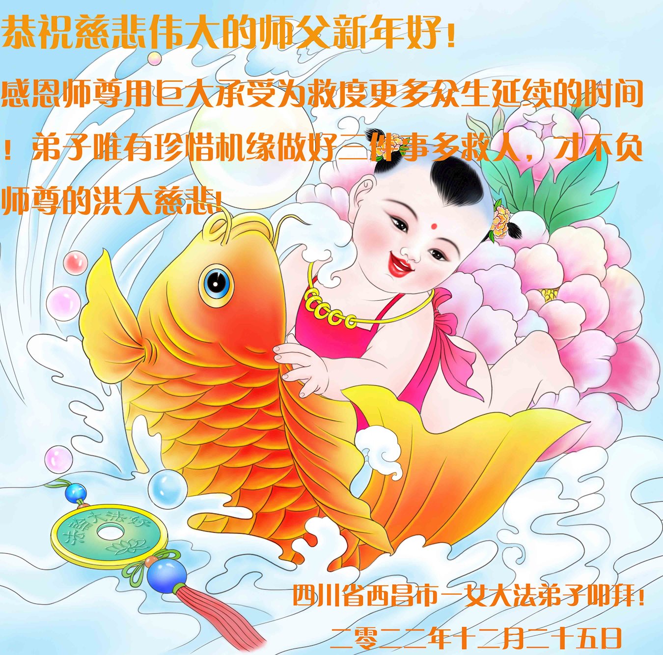 二零二三年元旦来临,我们四川省广汉市五名大法弟子恭祝师尊新年快乐! 感恩师尊救度!我们一定做好三件事,疫情蔓延期间多救人!跟随师尊回家! 四川省广汉市五名大法弟子恭祝 2022年12月26日 四川省凉山州西昌市一夫妻大法弟子恭祝师尊元旦快乐!