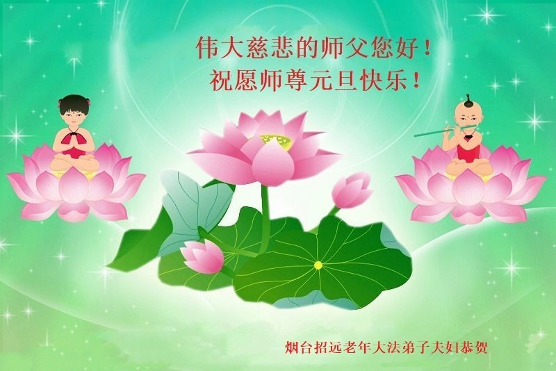 大陆瘟疫四处起 常人关门保自己 大法弟子乘时机 抓紧时机救人急 淘汰恶人显奇迹 弟子跟师步伐急 祝师元旦心欢喜 弟子衷心祝愿您 佛恩浩荡记心里 法正人间显奇迹 山东省烟台大法弟子夫妻二人恭祝师父新年好!
