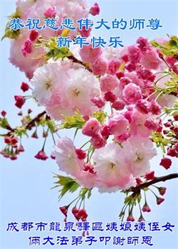 四川省成都市龙泉驿区姨娘姨侄女俩大法弟子恭祝慈悲伟大的师尊新年快乐!