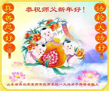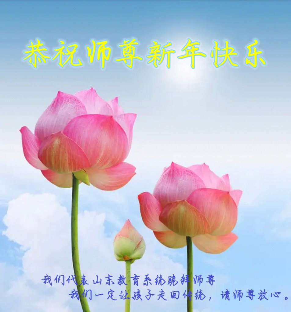 我们代表山东教育系统大法弟子跪拜师尊!我们一定让孩子走回传统,请师尊放心。 大陆教育系统大法弟子及家人恭祝慈悲伟大的师尊新年快乐!