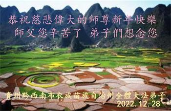 【明慧网二零二二年十二月三十日】 贵州省贵阳市一学法小组大法弟子恭祝师父新年快乐!
