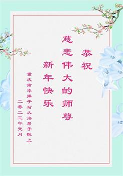 感恩师父的慈悲救度!修大法有福报,家人都受益,弟子感恩不尽。修好自己,随师法正人间。叩拜师尊! 重庆沙坪坝大专院校大法弟子恭祝师尊新年快乐!