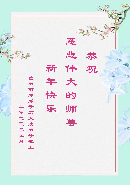 恭祝慈悲伟大的师尊新年快乐!重庆南岸弹子石大法弟子敬上 二零二三年元月 重庆市綦江区松藻矿区全体大法弟子恭祝慈悲伟大的师父新年快乐!
