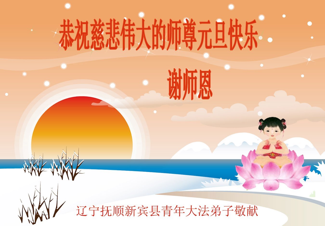 在这个辞旧迎新的日子里,恭祝慈悲伟大的师尊元旦快乐!虽然我们相隔千山万水,师尊时时在我们身边保护我们,我们十分想念师尊,在新的一年里,我们不要辜负师尊期望和慈悲苦度,学好法,做好三件事,多救人,让师尊少为弟子操心,多一份欣慰。完成史前大愿,早日随师尊回家! 辽宁大法弟子恭祝师尊新年快乐!