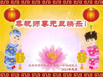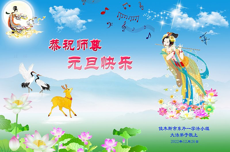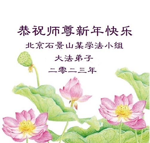 师尊:您好!您辛苦了!弟子们在此跪拜师尊。在2023年来临之际,回顾过去的一年,弟子们对您有表达不尽的感恩。我们的点点滴滴的進步,心性的升华,都是您的心血换来的,您给我们的真是太多太多!弟子只有更好的实修自己,做好三件事,特别是抓紧时间多救人,兑现自己的誓约,完成我们的历史使命以报师恩。 湖北武汉新园学法小组全体弟子恭祝 北京昌平一学法小组大法弟子恭祝师父新年快乐!
