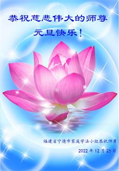 师父带弟子们修炼已走过了三十个春秋。师父为弟子承受着巨难,使弟子由一个不懂什么是修炼到明白了人生的真谛是返本归真的修炼人。师父您辛苦了!感恩师父的慈悲苦度,感恩师父的慈悲保护!不管修炼的路还有多远,弟子一定听师父的话,做好三件事,走好走正最后的修炼路。 弟子叩谢师尊! 云南省昆明市盘龙区一学法小组全体大法弟子敬祝 二零二二年十一月十八日 福建省宁德市一家庭学法小组大法弟子恭祝师尊元旦快乐!