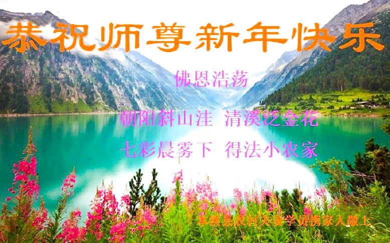 恭祝师尊新年快乐! 佛恩浩荡 朝阳斜山洼 清溪泛金花 七彩晨雾下 得法小农家 辽宁省本溪县农村夫妻大法弟子携家人敬上 山东省青岛市平度市古岘镇大法弟子恭祝师父新年快乐!