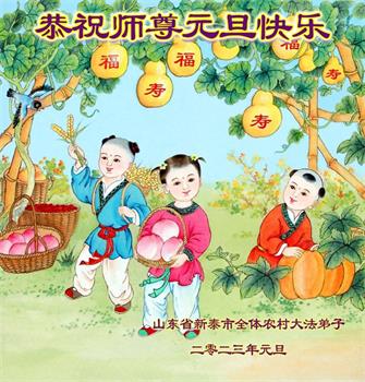 颂师恩 新年到,感师恩。 悠万载,法缘引。 万般苦,度众生。 师导航,传福音。 蟾妖灭,众生醒。 荡阴霾,妙无尽。 撒甘露,日月新。 迎曙光,颂师恩。 叩拜师父! 山东大法弟子敬上 二零二二年十二月十五日 山东省泰安新泰市全体农村大法弟子恭祝师尊元旦快乐!