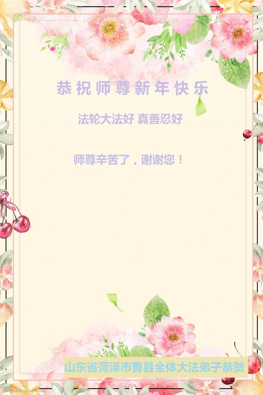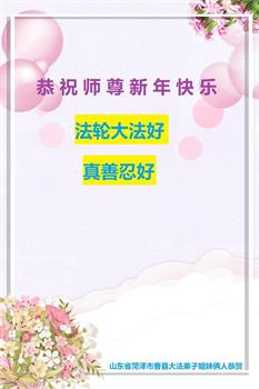 恭祝师尊新年快乐!谢谢师尊的慈悲救度!师尊您辛苦了! 弟子惟愿在以后有限的时间里做好三件事,修好自己,救度众生!千言万语也说 不尽弟子对您的感恩。 谢谢师尊!谢谢师尊!谢谢师尊! 山东省菏泽市曹县全体大法弟子恭祝师尊新年快乐!