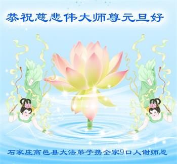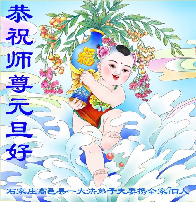 师尊您好,师尊辛苦了! 在新年元旦到来之际我们全家恭祝伟大的师尊元旦快乐!在师尊的保护下我们走过了二十多年的修炼历程,其中有苦有乐同时也伴随着艰难与心酸,一路走过来了。现在正法已经到了最后,我们必须加倍做好师尊要求的三件事,不负使命。 河北省石家庄市辛集市一学法小组大法弟子恭祝师尊新年快乐!叩拜师尊!