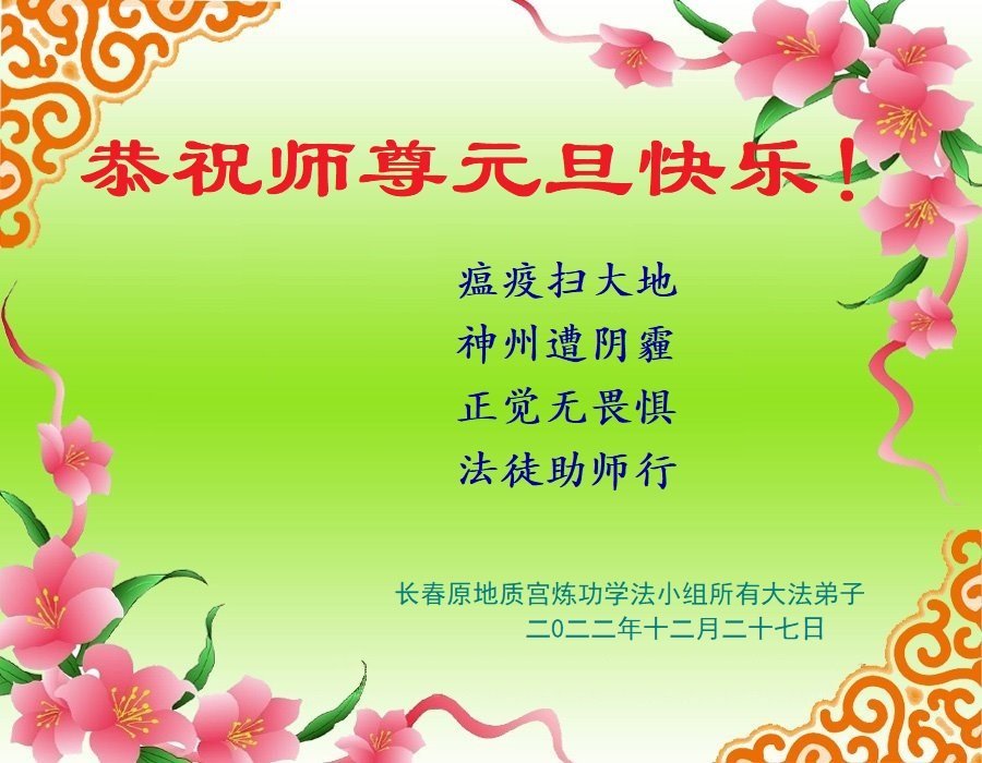 长春原地质宫炼功学法小组所有大法弟子恭祝师尊元旦快乐! 瘟疫扫大地 神州遭阴霾 正觉无畏惧 法徒助师行 二零二二年十二月二十七日 吉林省长春一大法弟子恭祝师尊新年好!