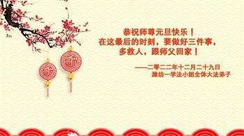 在新的一年里,我们一定多学法,发好正念,踏踏实实的修好自己,多救人,兑现自己的誓约! 山东潍坊大法弟子恭祝师尊新年快乐!