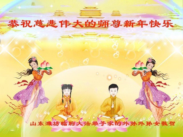 山东省潍坊市临朐县大法弟子的外孙、外孙女恭祝慈悲伟大的师尊新年快乐!