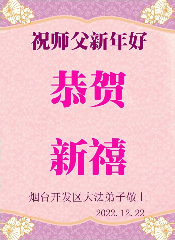 2022年,世事动荡,匆匆走过;2023年,依然风云变幻,注定不平凡。 慈悲伟大的师尊依然在用巨大的承受,再次将历史翻开新的篇章。 在新的一年里,愿师尊的法徒更加成熟,学好法讲好真相,让更多的世人明大法真相得救度,让苦难的心感受到法光的温暖,愿大法的光辉洪贯全苍宇,愿师尊感欣慰展欢颜。 烟台开发区一学法小组大法弟子敬祝 2022年12月22日 重庆市万州一学法小组大法弟子恭祝慈悲伟大的师尊新年快乐!
