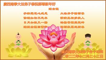 在新的一年里,即使在疫情严重的情况下,我们依然在坚持学好法,做好三件事,加紧讲真相救人,请师尊放心。 云南省普洱市澜沧县大法弟子敬祝 广西南宁大法弟子恭祝师尊新年好!
