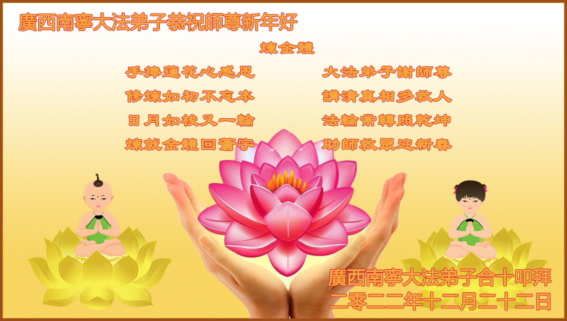 炼金体 手捧莲花心感恩 大法弟子谢师尊 修炼如初不忘本 讲清真相多救人 日月如梭又一轮 法轮常转照乾坤 炼就金体回苍宇 助师救众迎新春 广西南宁大法弟子合十叩拜 二零二二年十二月二十二日 福建省福州市一大法弟子恭祝伟大慈悲的师尊新年快乐!